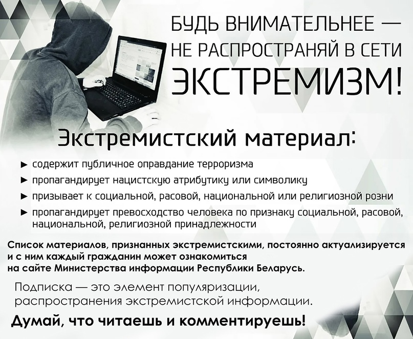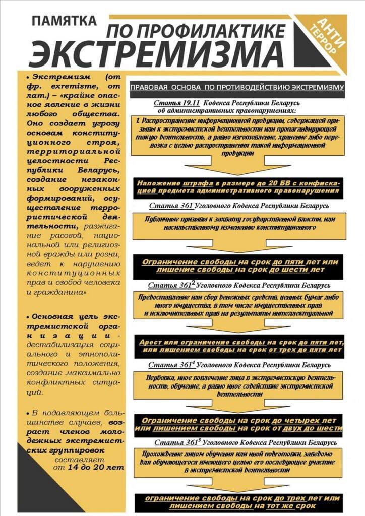 В Республике Беларусь установлена административная ответственность (19.11 КоАП Республики Беларусь) за распространение, изготовление, хранение, перевозку информационной продукции, содержащей призывы к экстремистской деятельности или пропагандирующей такую деятельность.